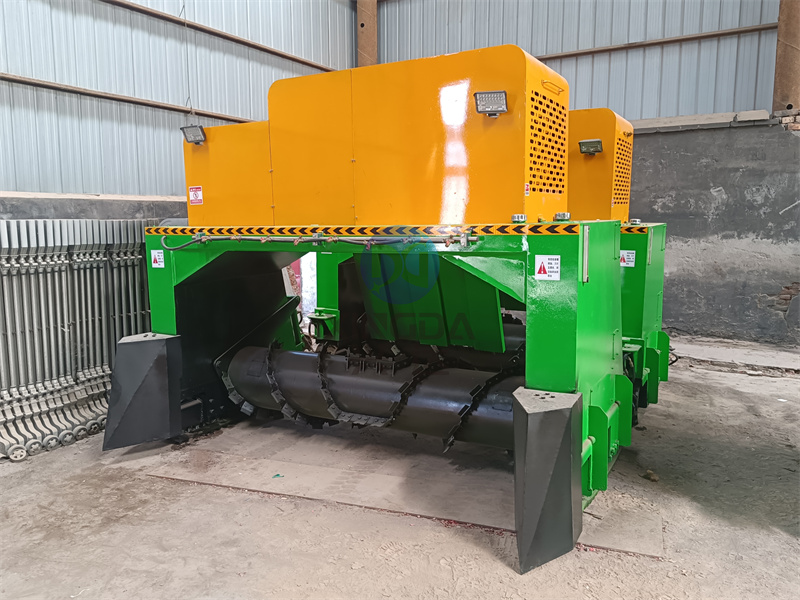 3、行駛中整車騎跨在預先堆置的長條形肥基上,由機架下掛裝的旋轉刀軸對肥基原料實施翻拌、蓬松、移堆,車過之后成新的條形垛堆。在翻拋過程中,物料被高速旋轉的滾筒帶起并向后移動一定的距離所以在翻拋過程中,翻拋機可對物料打散、粉碎,并帶走部分水分。