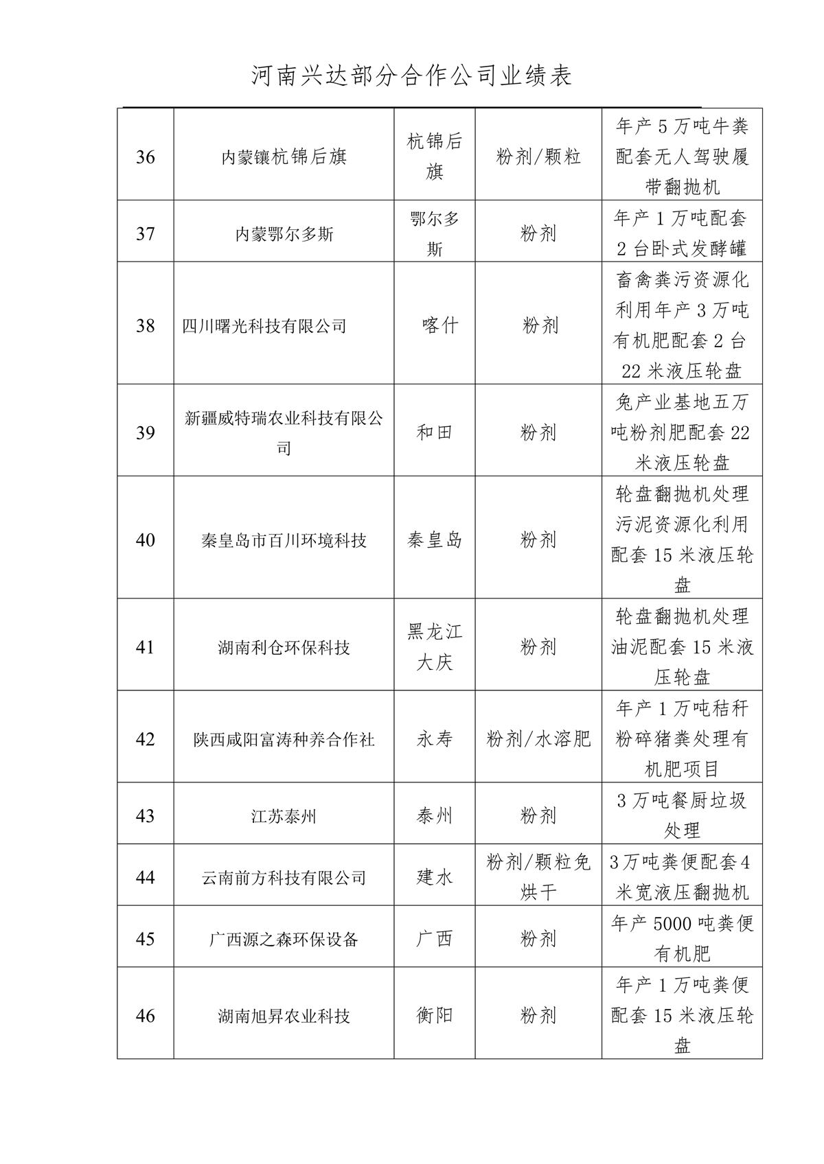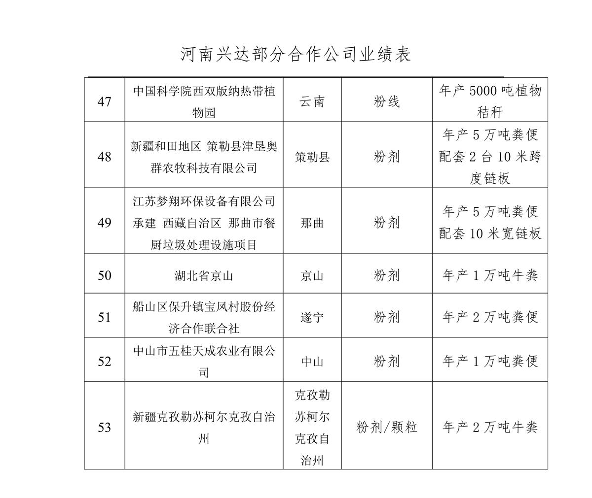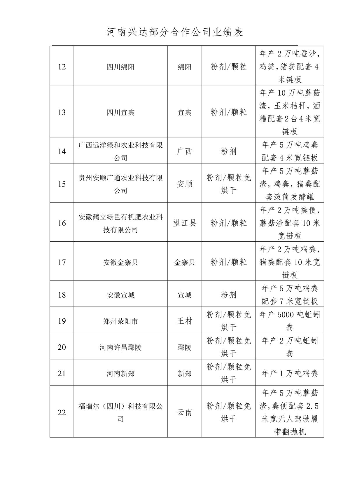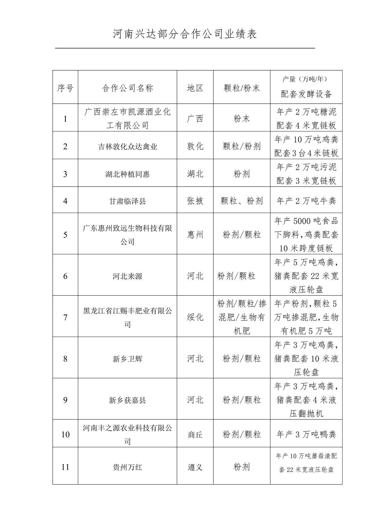河南興達近期部分合作公司業績表, 廣西崇左市凱源酒業化工有限公司,吉林敦化眾達禽業,湖北種植同惠,廣東惠州致遠生物科技有限公司,黑龍江省江賜豐肥業有限公司等,以上客戶現場可以隨時參觀考察!