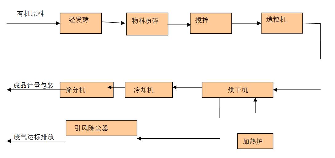 1.主要是將物料(牛糞.羊糞.豬糞.雞糞.污泥.稻草.玉米秸.蘑菇渣)等動(dòng)物糞便有機(jī)廢棄物經(jīng)過發(fā)酵腐熟以后含水分約30%-35% 的有機(jī)廢棄物經(jīng)粉碎篩分后,與黏結(jié)劑(膨潤土.腐殖酸)及需配比的其他成分的原料按配比要求在配料混合系統(tǒng)中進(jìn)行計(jì)量、(添加功能菌可生產(chǎn)生物有機(jī)肥,添加氮、磷、鉀(總養(yǎng)分含量低于15%)可生產(chǎn)有機(jī)無機(jī)肥)配料、混合,經(jīng)充分混合后的物料由皮帶輸送機(jī)均勻連續(xù)的喂入造粒機(jī)中,經(jīng)拋光整形機(jī)拋圓成球狀顆粒,經(jīng)烘干機(jī)進(jìn)行低溫大風(fēng)量烘干(≤65℃)后進(jìn)行冷卻、篩分,成品顆粒由皮帶輸送到成品料倉,經(jīng)電腦定量包裝系統(tǒng)計(jì)量、包裝入庫。
