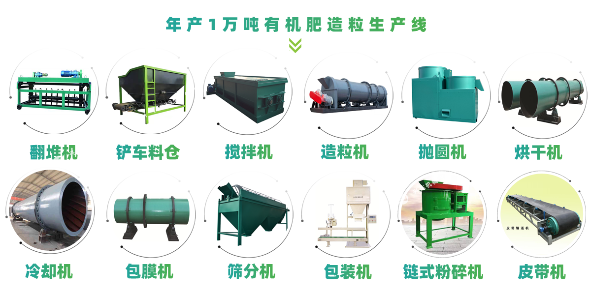 在本生產(chǎn)線里我配備的粉碎機(jī)是半濕物料粉碎機(jī)主要用于水分在25—30%的雞糞,牛糞,豬糞,羊糞,以及其他物有機(jī)物料的粉碎效果極佳,設(shè)備配置里邊造粒機(jī)我?guī)湍渲昧诵滦陀袡C(jī)肥造粒機(jī),主要適用于畜禽糞便、酒糟、藥渣、沼渣、木粉等含有纖維素的有機(jī)物料,可以直接造粒,成球率高,顆粒強(qiáng)度好,節(jié)省烘干成本,生產(chǎn)過程中主機(jī)不需要專人操作。將發(fā)酵后的物料進(jìn)入粉碎機(jī)打成粉狀后;將物料輸送至攪拌機(jī)均勻攪拌;攪拌均勻后通過輸送機(jī)進(jìn)入造粒機(jī)造粒,造出來的顆粒因?yàn)樗直容^大需要進(jìn)入烘干機(jī)去除水分;顆粒從烘干機(jī)出來以后溫度高,由于烘干產(chǎn)生的冷凝水附著在顆粒表層,不易包裝,容易結(jié)塊,所以要經(jīng)過冷卻機(jī)利用加快空氣回流的原理使顆粒表層溫度降低,將冷凝水變成蒸汽揮發(fā),這一道工藝可以大大促進(jìn)肥料的保存效果,增長保存周期;冷卻之后的顆粒還存在大小不一的情況,要經(jīng)過篩選機(jī),把不符合標(biāo)準(zhǔn)的要經(jīng)過篩選機(jī)廢料出口粉碎之后重新進(jìn)入造粒機(jī)再次造粒,符合標(biāo)準(zhǔn)的顆粒就可以直接打包銷售了。